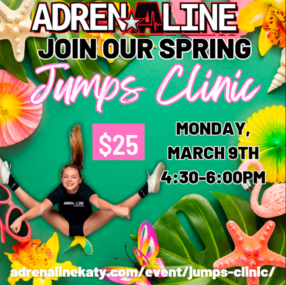 Join Adrenaline Athletics for a fun and focused Cheer Jumps Clinic designed to help athletes improve their jump technique, height, and performance. This clinic is perfect for athletes who want...