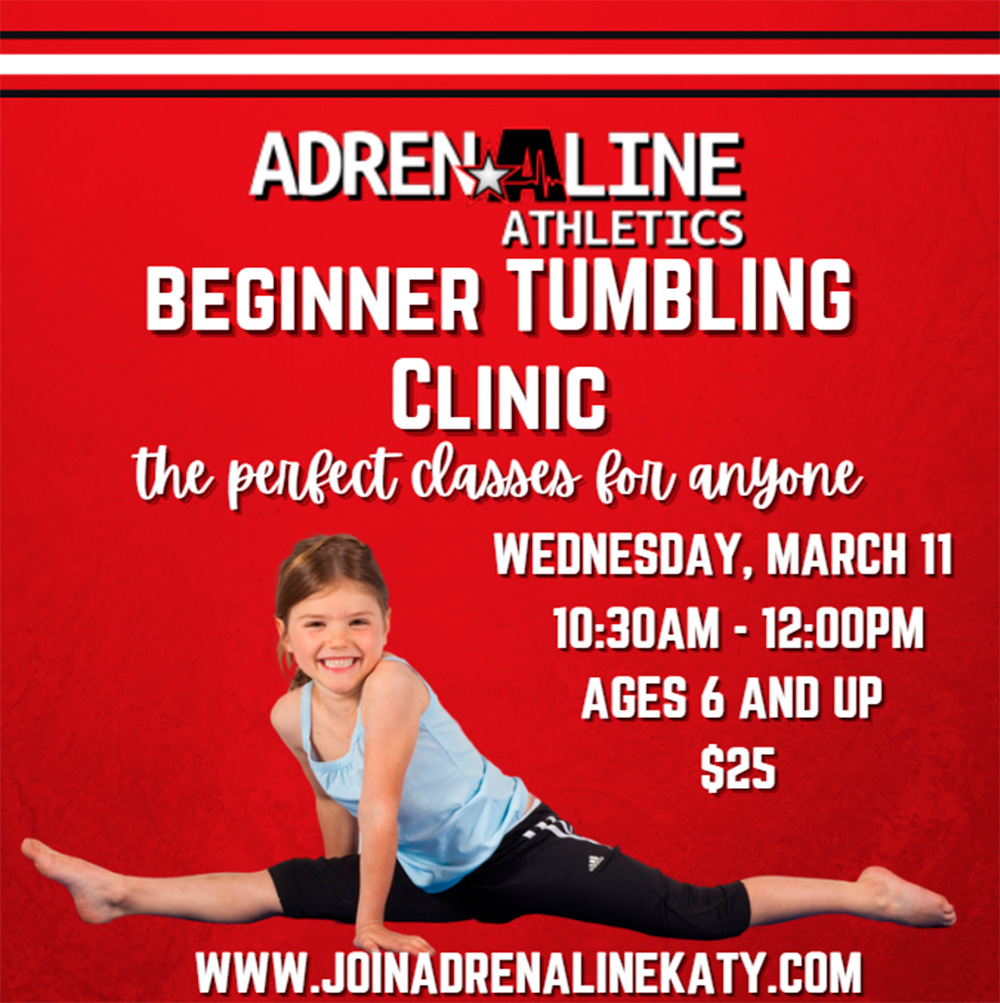 Join Adrenaline Athletics for a fun and energetic Beginner Tumbling Clinic on March 9th. This clinic is designed especially for athletes who are new to tumbling and excited to learn...